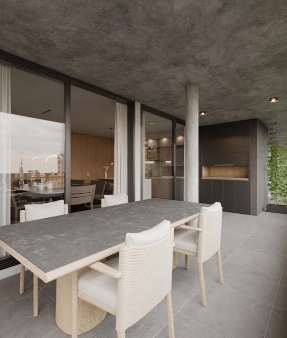 DEPARTAMENTOS Desde el segundo piso se desarrollan unidades de vivienda de uno, dos y tres dormitorios con terminaciones de alta calidad. Puertas de ingreso de seguridad. Cocinas equipadas con alacenas y muebles bajo mesada, anafe de 4 hornallas, horno empotrado y calefón marca Longvie o similar, mesadas de granito y bachas de acero inoxidable. Pisos porcelanatos en living, cocina, baños y balcones. Piso de instalación flotante símil madera en dormitorios para brindar calidez a estos ambientes. Placares con interior. Amplios balcones aterrazados y aberturas de aluminio con doble vidriado hermético. Pre instalación para AA.