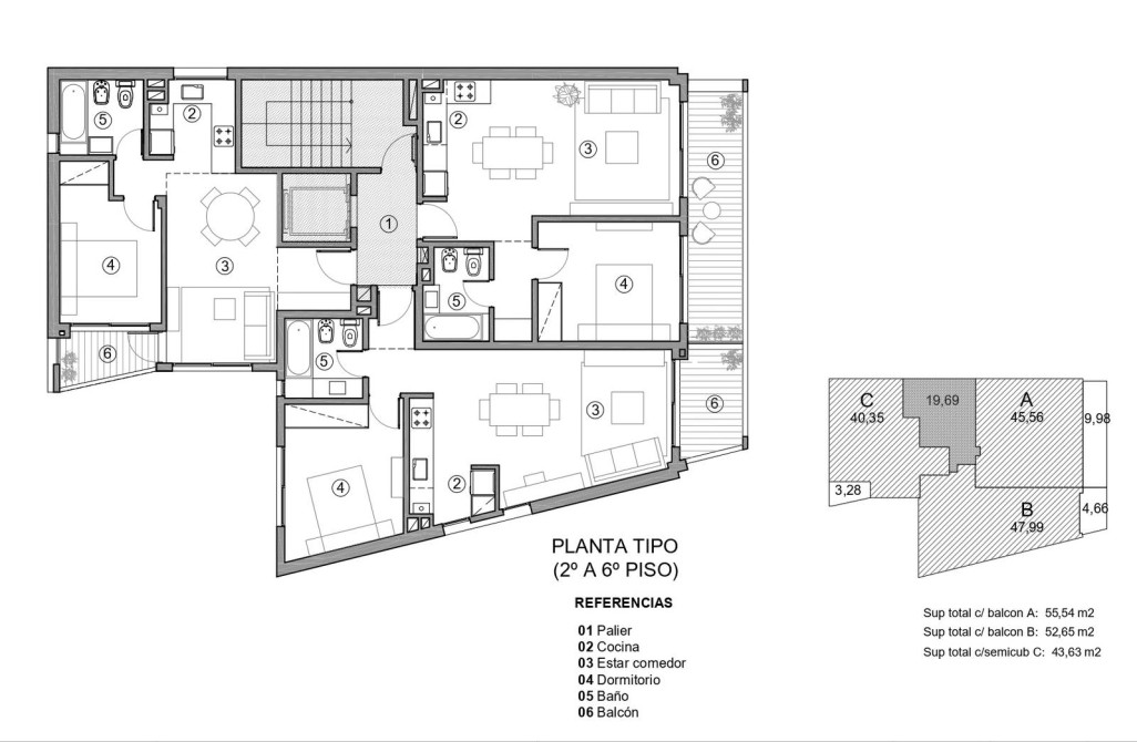 * Unidades de 1 dormitorio desde 43 m² a 55 m² (con patios en primeros pisos o amplios balcones en pisos superiores)
