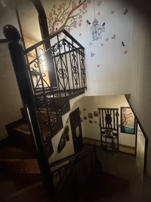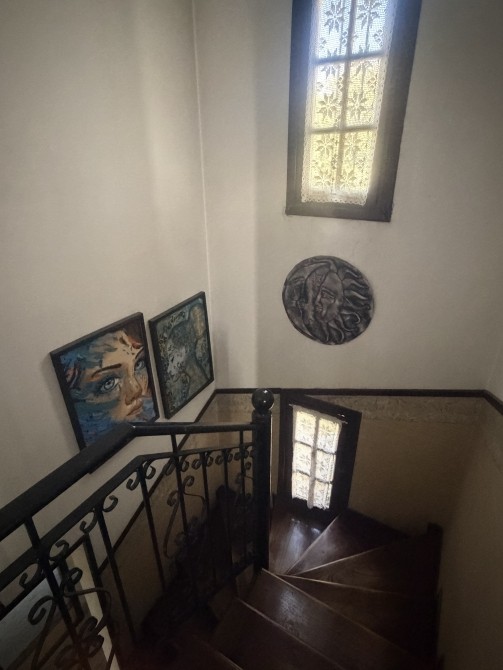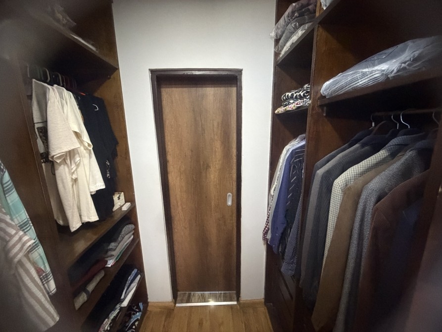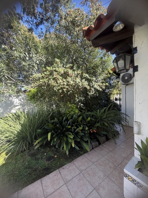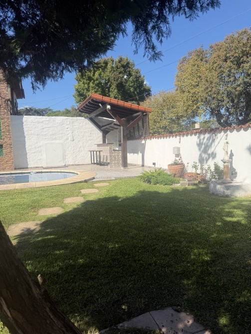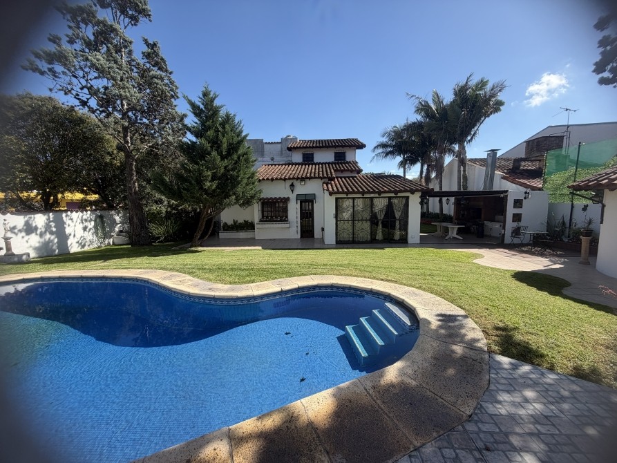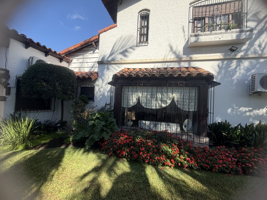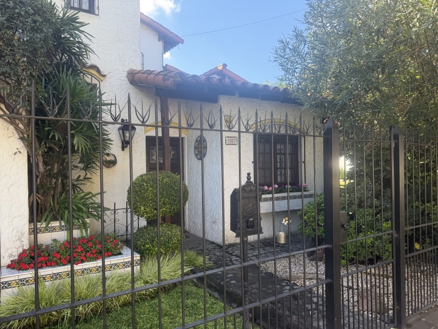 con portón eléctrico a distancia para 2 vehículos cómodos. Quincho amplio cubierto, con parrilla. P.A.: Se accede por una imponente escalera de madera de estilo, con barandilla de hierro trabajado. Pasillo de distribución muy amplio. 3 dormitorios