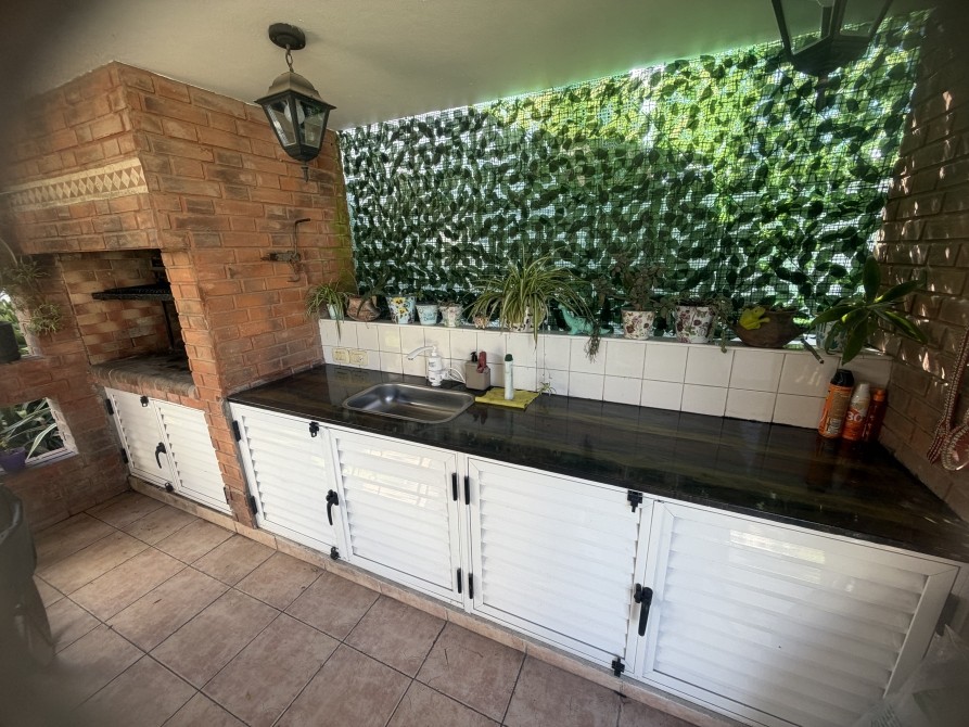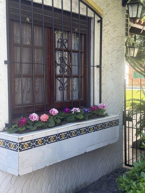 paredón de ladrillos con detalles de tejas coloniales y cerco vivo. Totalmente parquizado. Riego artificial. Muy linda pileta