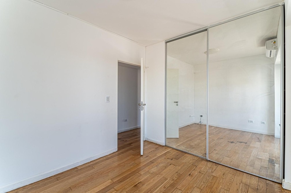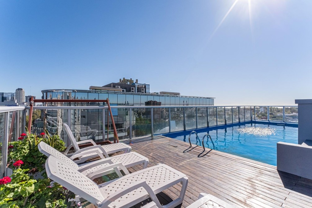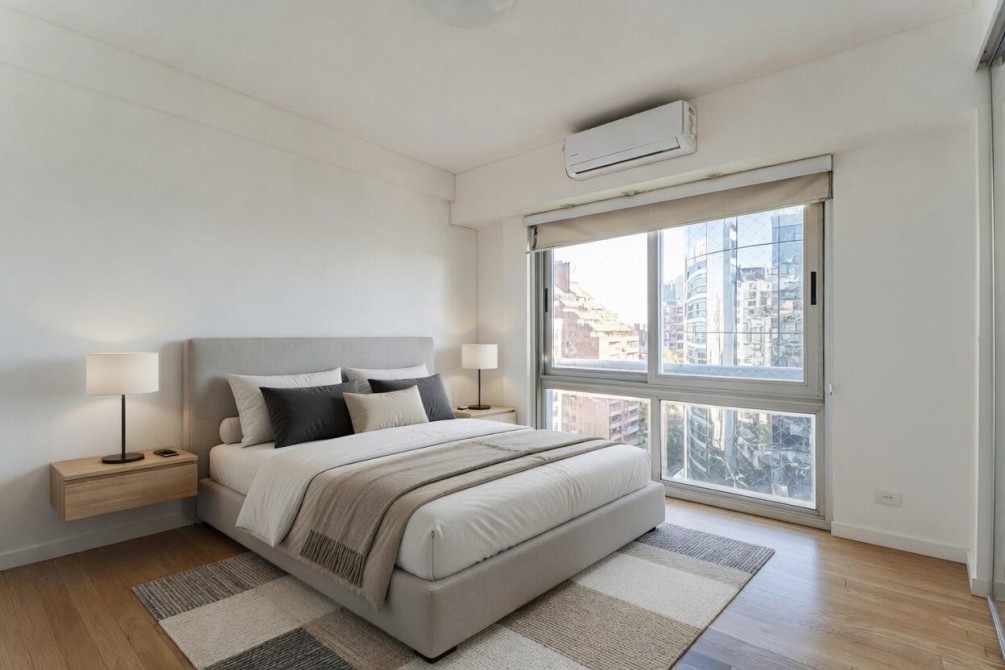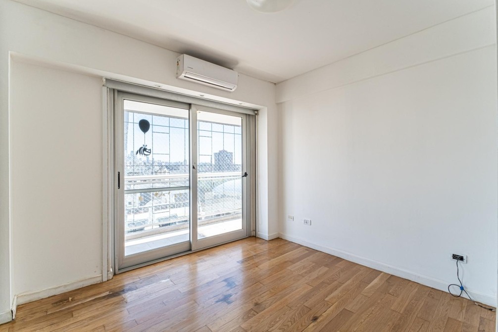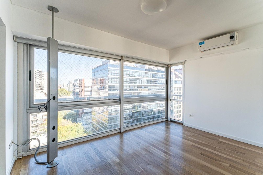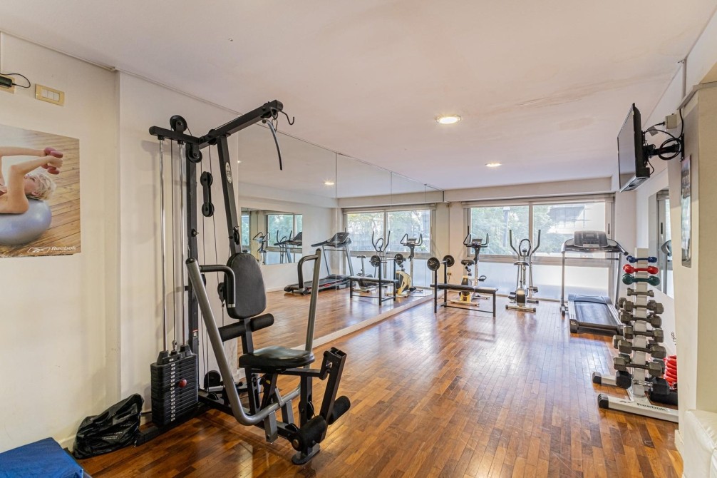Entre las amenidades se incluye una cochera cubierta fija, seguridad las 24 horas, ascensor con accesibilidad para movilidad reducida, gimnasio, pileta, parrilla y SUM. La calefacción es central, complementada con aire acondicionado individual y losa radiante general.