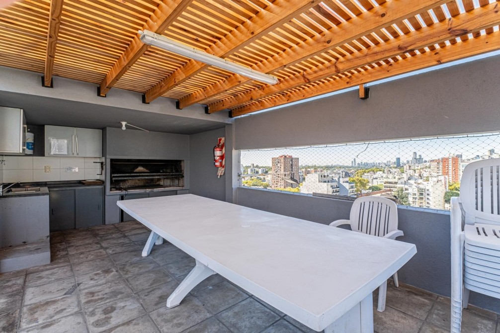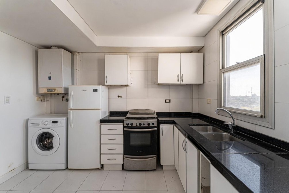 El departamento cuenta con un diseño funcional y moderno, destacándose un amplio living comedor que se integra con un balcón, ideal para disfrutar de vistas despejadas. La cocina es espaciosa y está equipada para satisfacer las necesidades de cualquier entusiasta culinario. Incluye una dependencia con baño y un área de servicio, proporcionando mayor comodidad.